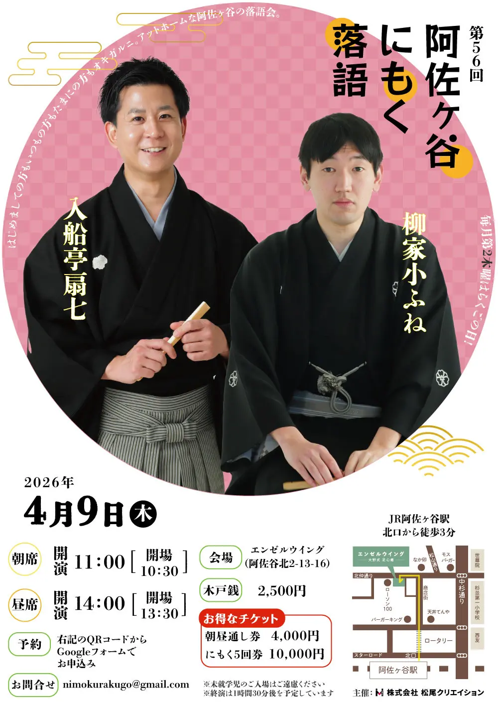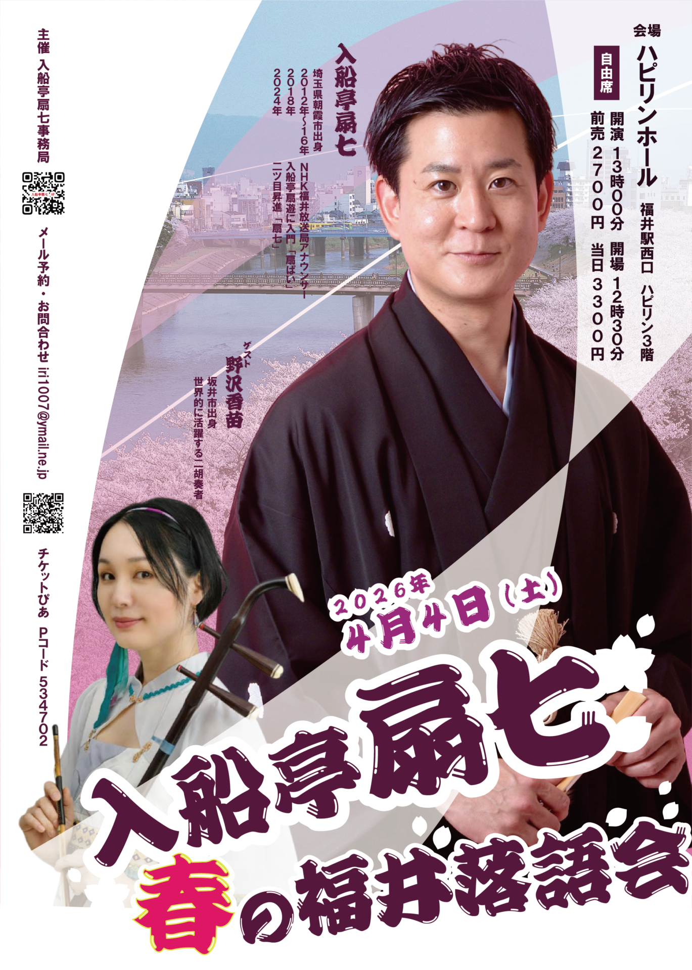福井県出身で世界的に活躍する二胡奏者・野沢香苗さんをゲストにお迎えします。 落語×二胡のコラボを是非、お楽しみください。 チケットは、メール予約。もしくは、チケットぴあで購入出来ます。 また、福井在住の方は、ハピリンホールチケットセンター、片町の親玉菓舗でも購入できます。